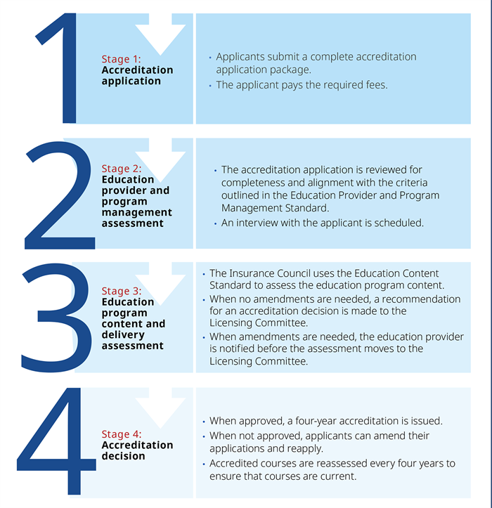 The accreditation process establishes a transparent, multi-stage assessment for education providers and their programs. A set of established standards are used to determine course provider suitability to administer courses.